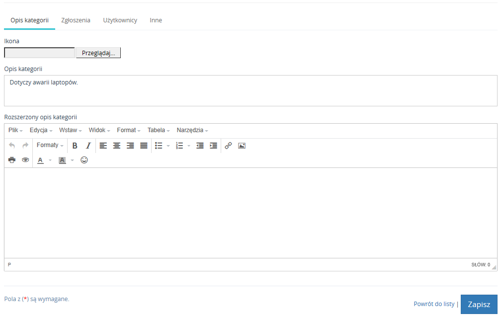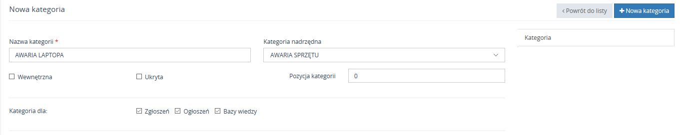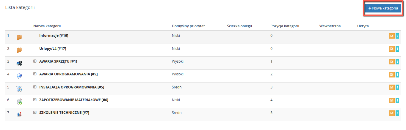 Zakładka Kategorie zgłoszeń odpowiada za budowanie/edycje kategorii. Nową kategorię można dodać poprzez przycisk Nowa kategoria.