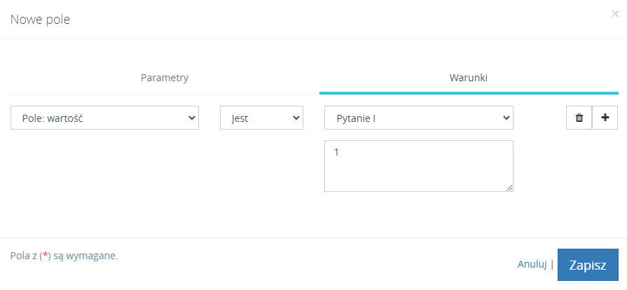 Na poniższym przykładzie widać, że dopóki w pierwszym pytaniu nie pojawi się wartość "1", drugie pytanie/pole nie zostanie wyświetlone.