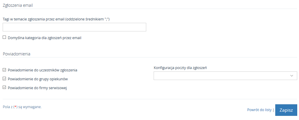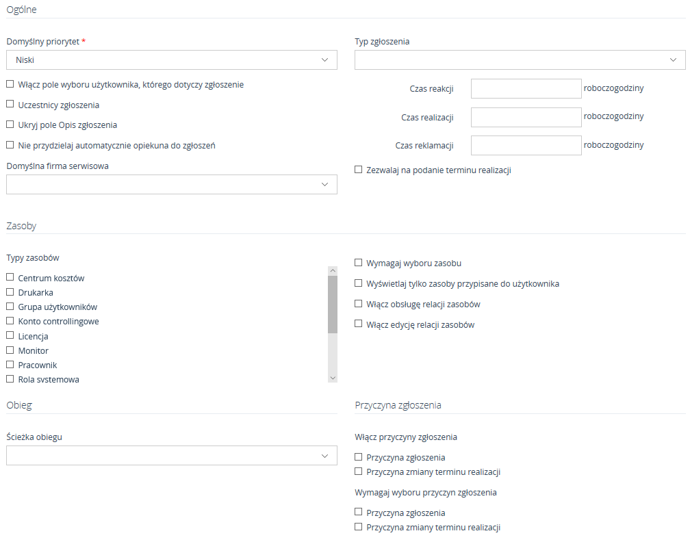 W oknie sekcji Zgłoszenia odbywa się konfiguracja dotycząca priorytetów, czasów SLA, zasobów powiązanych z kategorią co pozwala na wybranie przez zgłaszającego zasobu, którego dotyczy zgłoszenie, wybieranie ścieżki obiegu, włączenie przyczyn zgłoszenia oraz konfigurację zgłoszeń email i powiadomień.