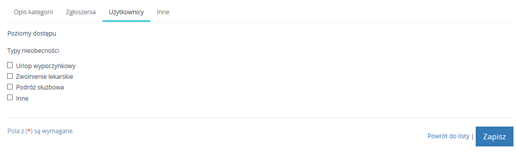 W sekcji Użytkownicy można wybrać Poziom Dostępu czy Typ nieobecności po odpowiedniej ich konfiguracji.
