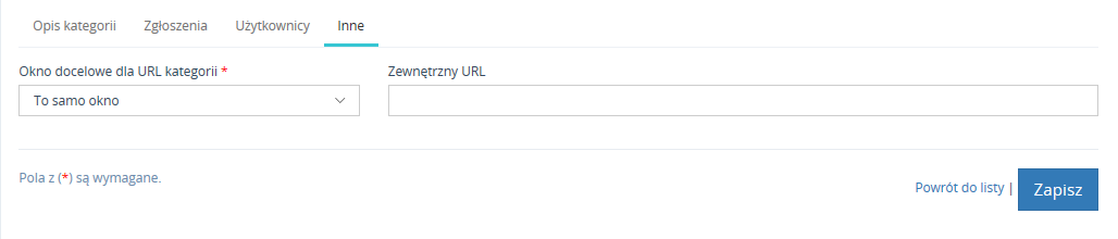W sekcji Inne można określić czy po kliknięciu w kategorię przy tworzeniu zgłoszenia nastąpi przekierowanie na inną stronę.