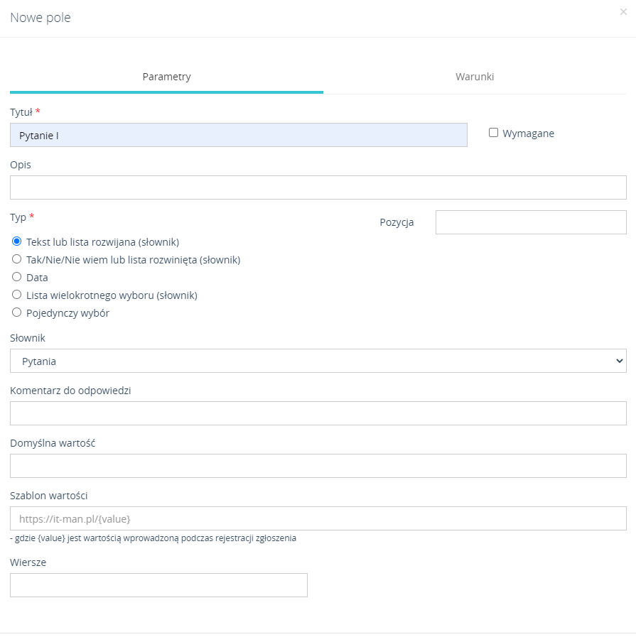 Dodając Nowe pole należy nadać mu nazwę oraz określić Typ, wartości dla pola mogą również zostać pobranie ze Słownika.