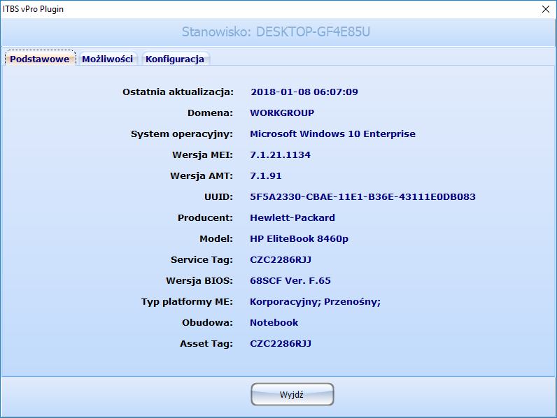 Konfiguracja – aktualna konfiguracja komputera pod kątem technologii vPro